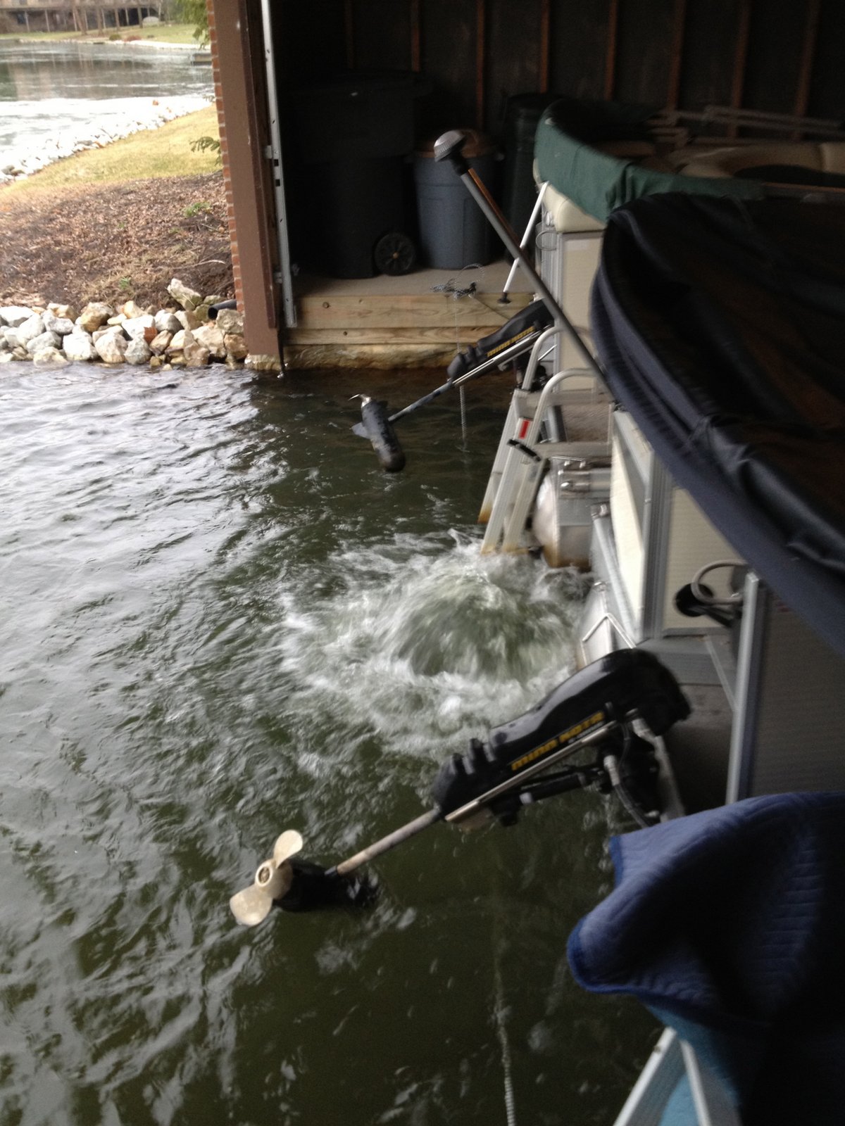 Scrap the heaters! On to Bubblers! The top picture shows a line between the 2 boats (yes, we're renting/giving space to our neighbors boat) with a device that churns the water. It's placed directely between the two boats. Now let the fun begin---Jim can do what he does best---TEST it! He can adjust a timer to come on whenever he wants to. He started off with Bubbler on for 12 hours, then off for 12 hours. Way over designed! Next iteration- on one hour, off one hour X 24 hours.
